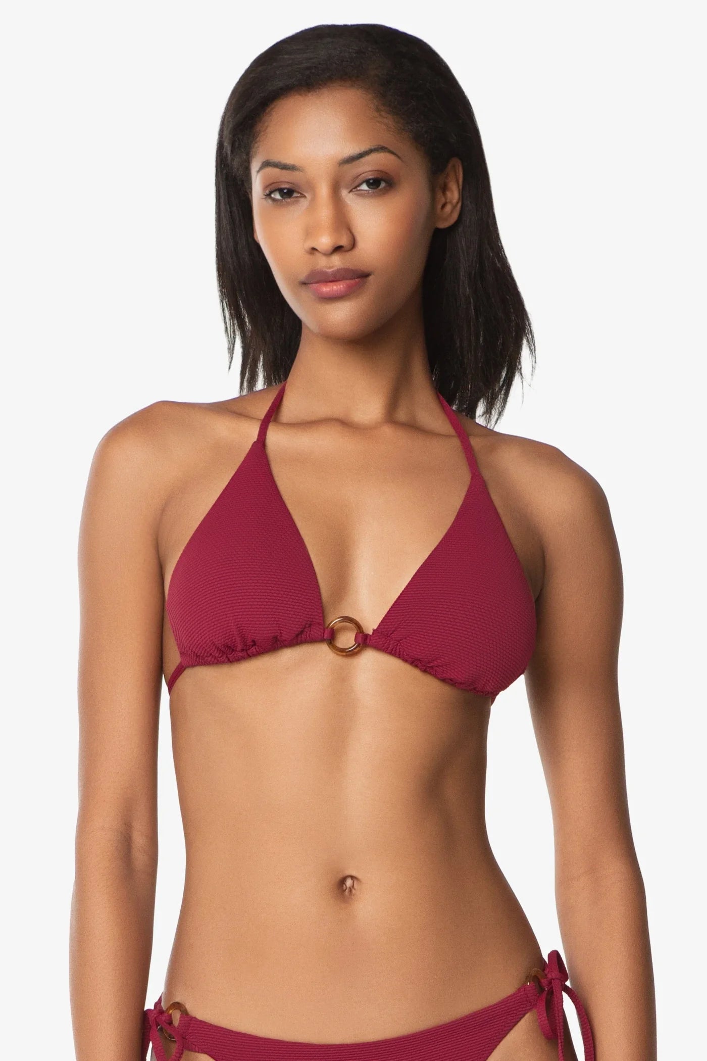 Looking for a bikini top that feels classic but still special? This Helen Jon ring string top in a rich Merlot textured solid delivers timeless style with an elevated twist, finished with sculptural faux-tortoise rings that instantly set it apart.