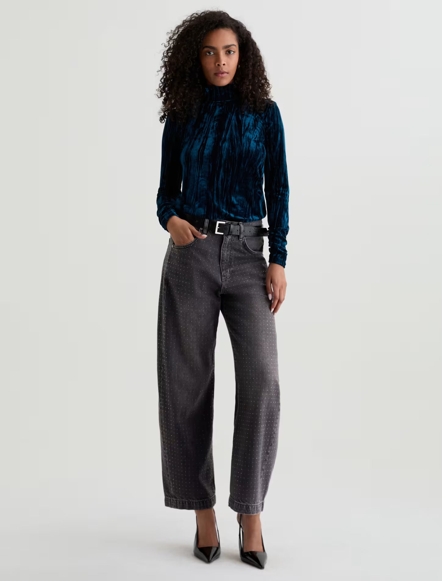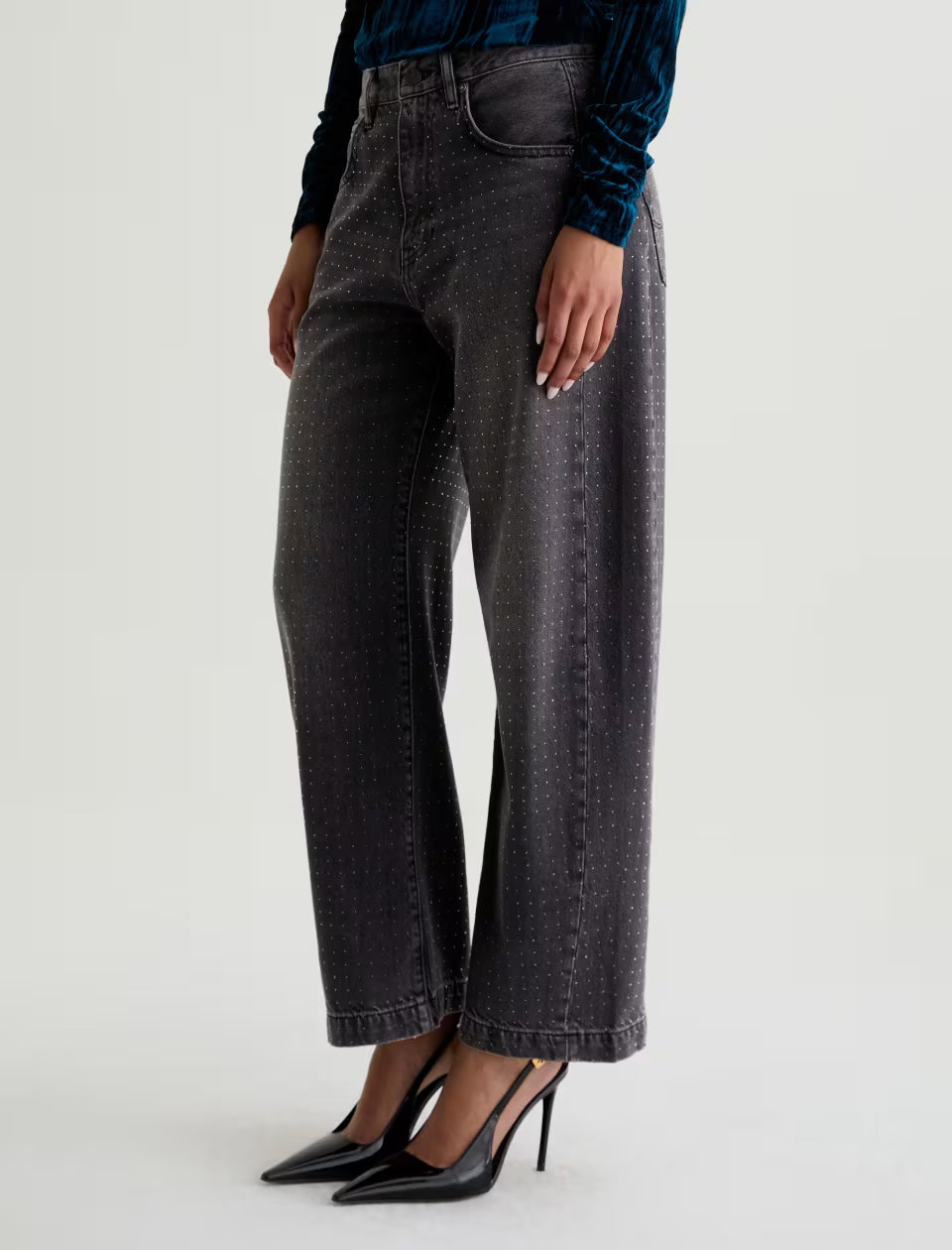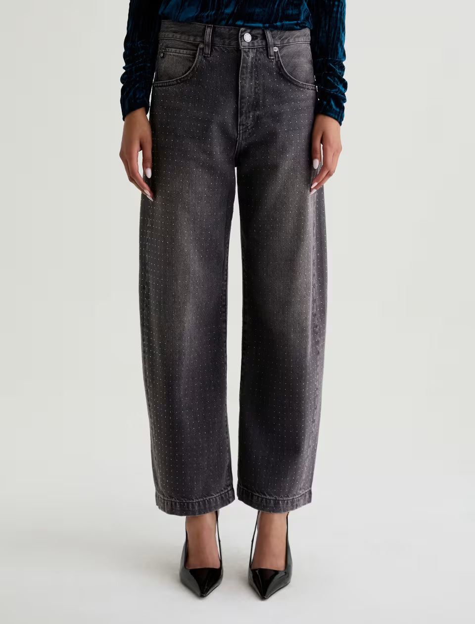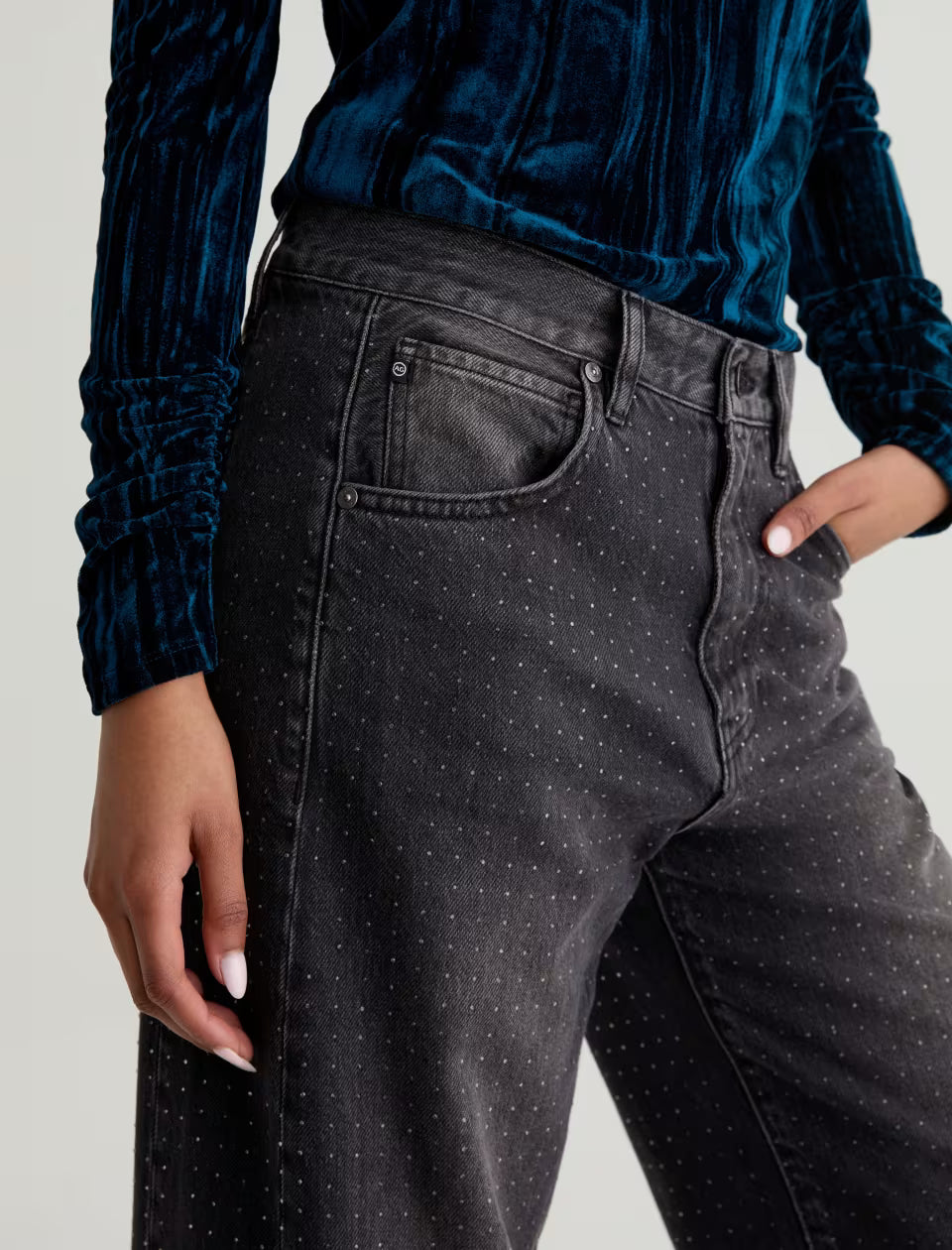 Looking for the perfect jean that adds just the right touch of sparkle? Meet the Hattie Barrel Jean in Starry Night from AG — a modern twist on one of our best-selling silhouettes. Designed with a flattering high-rise and distinctive curved barrel leg, this jean combines everyday comfort with a hint of understated glamour. Tiny clear rhinestones catch the light in all the right ways, making this pair effortlessly chic from day to night.