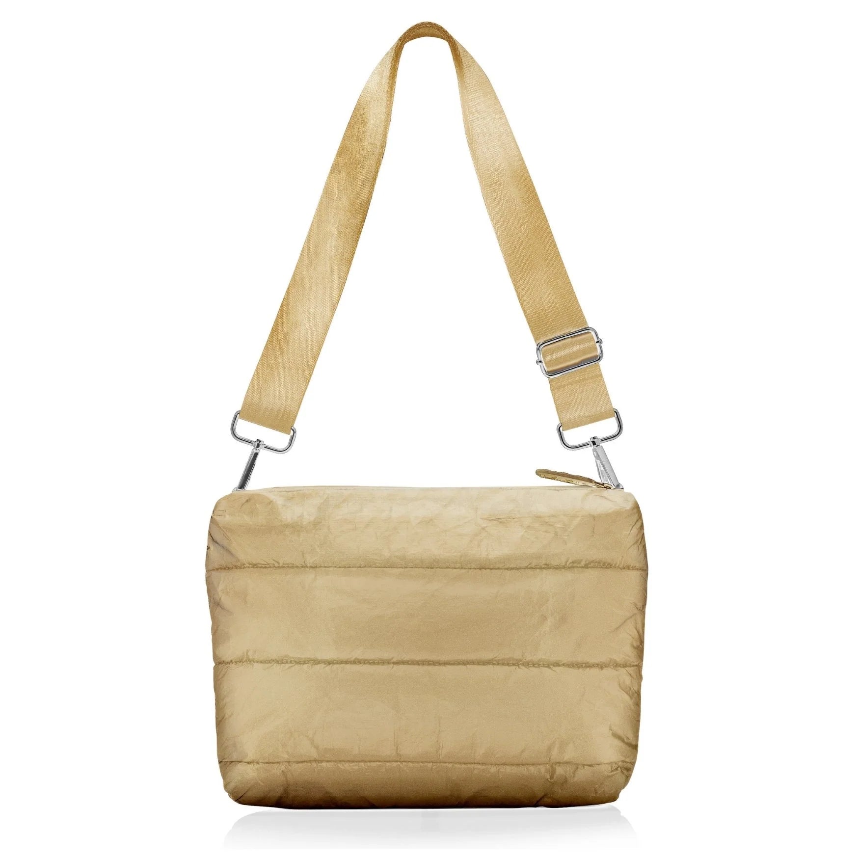 Ever wish your everyday bag could feel elevated and effortless? This chic gold puffer crossbody is the soft, lightweight, go-with-everything bag you'll reach for day after day — from errands to travel to nights out.