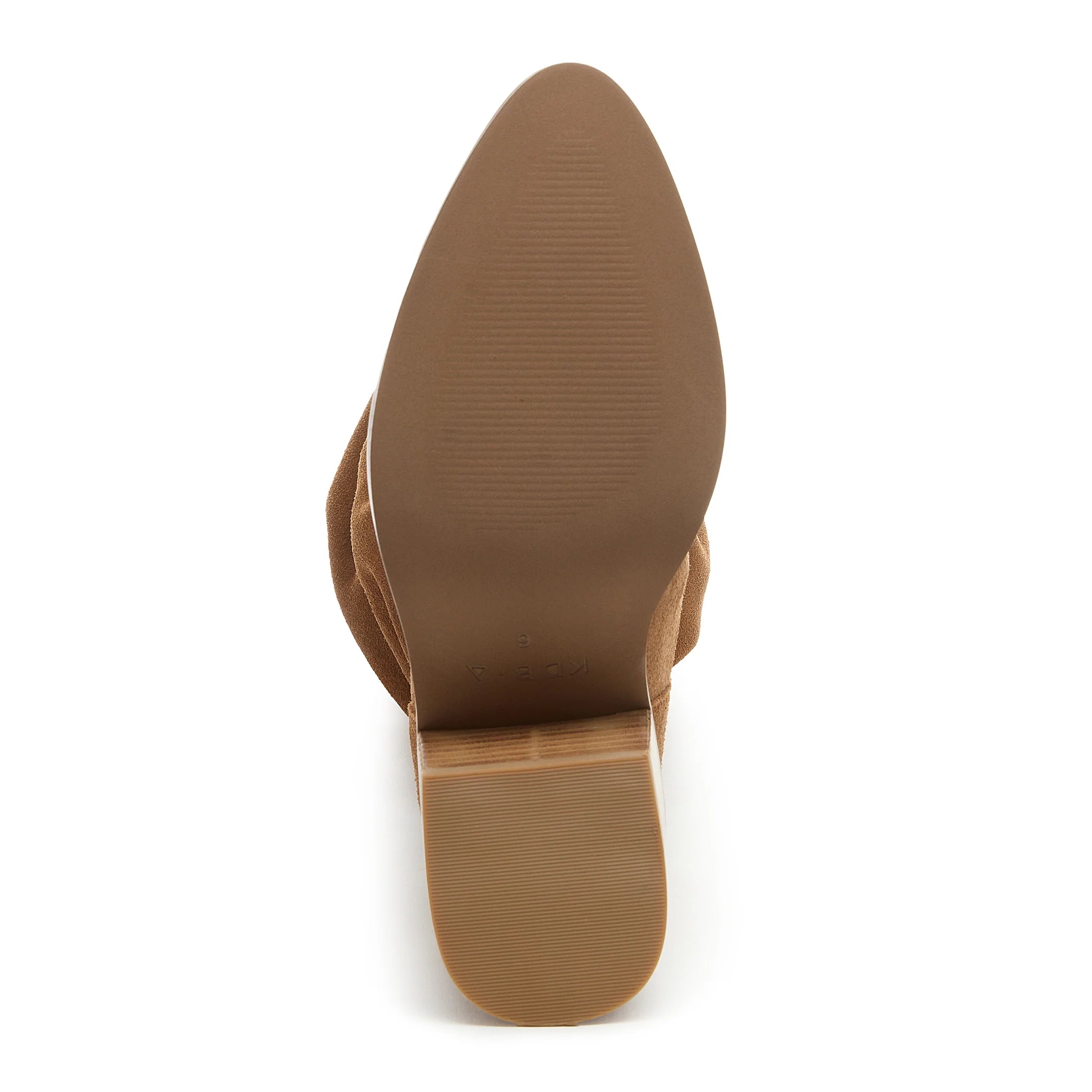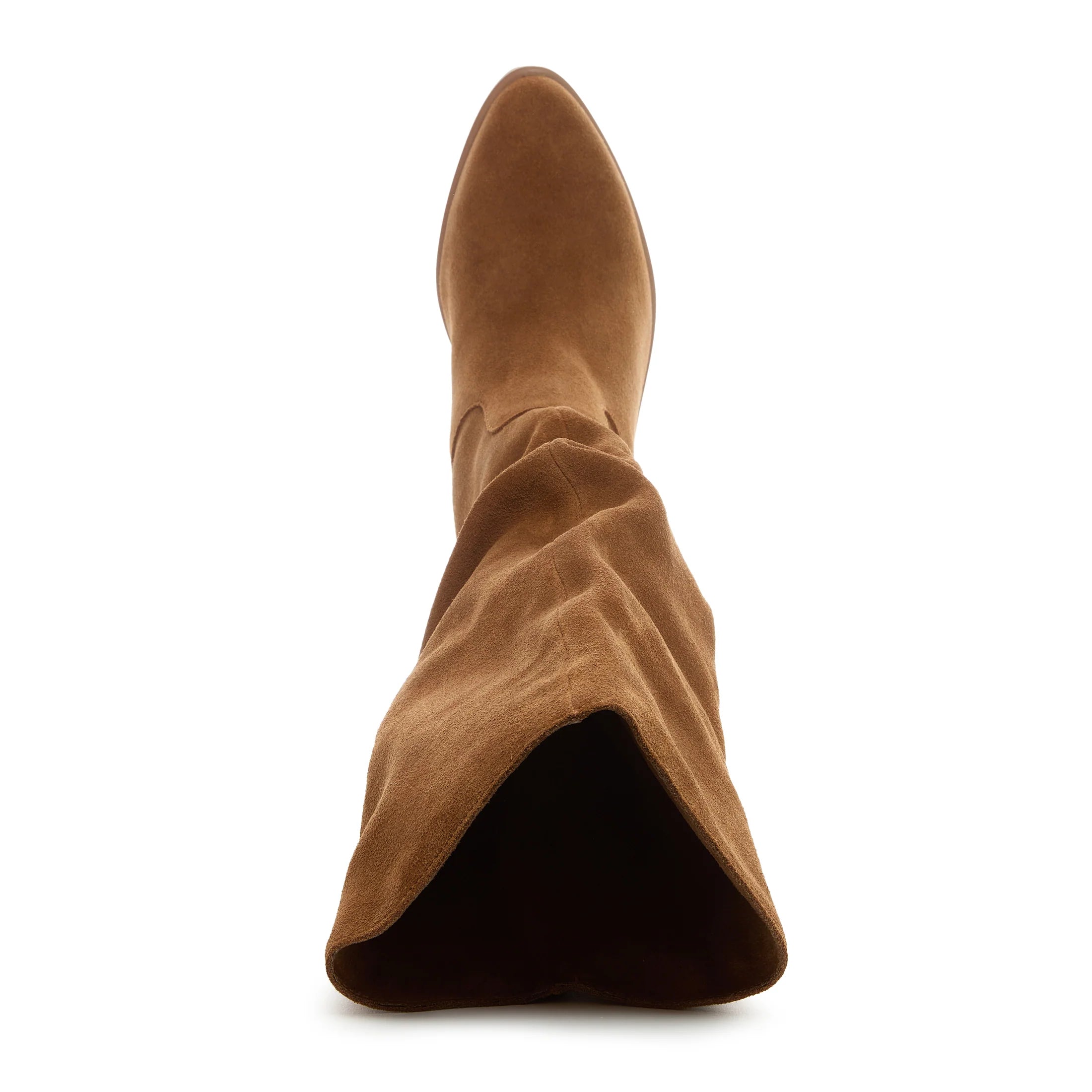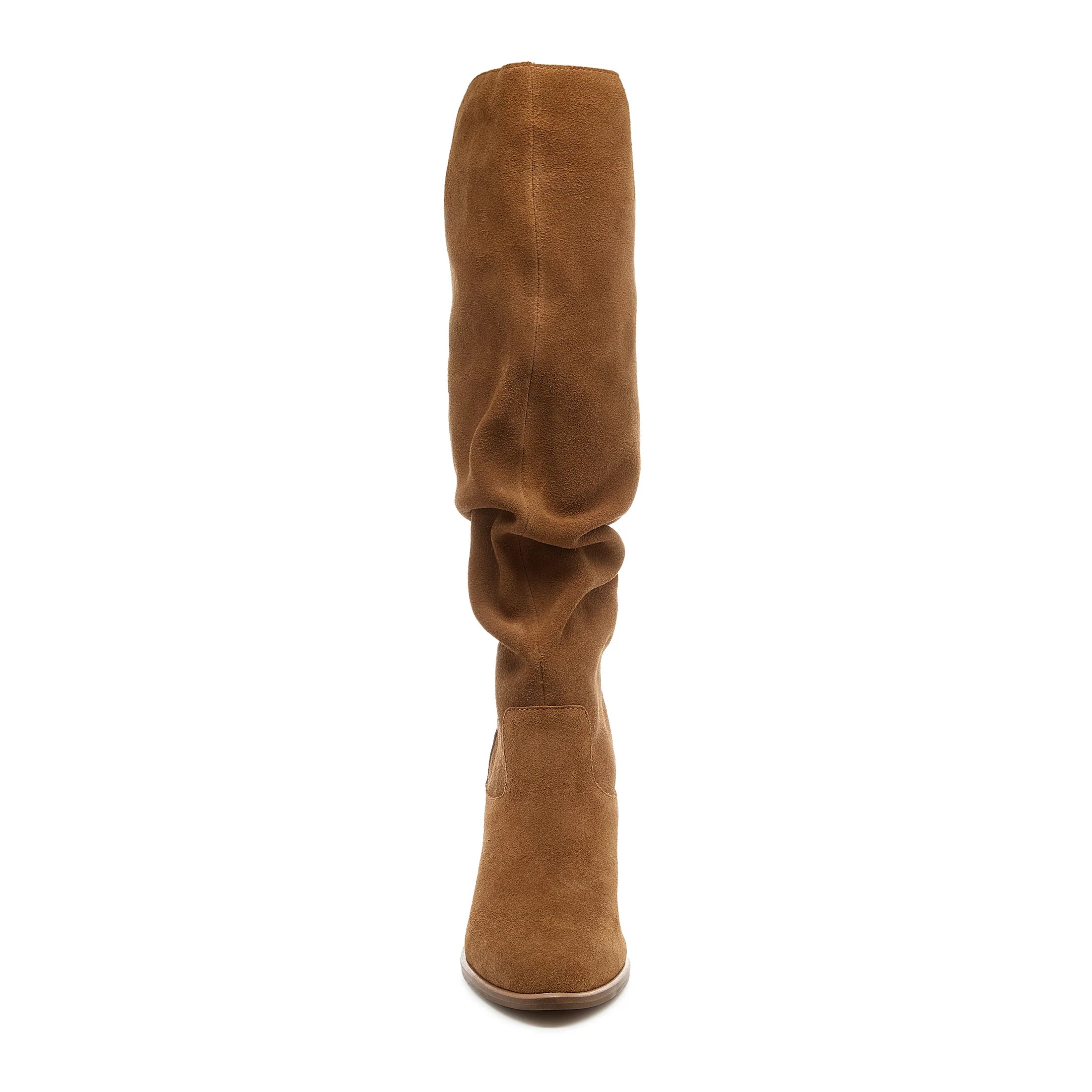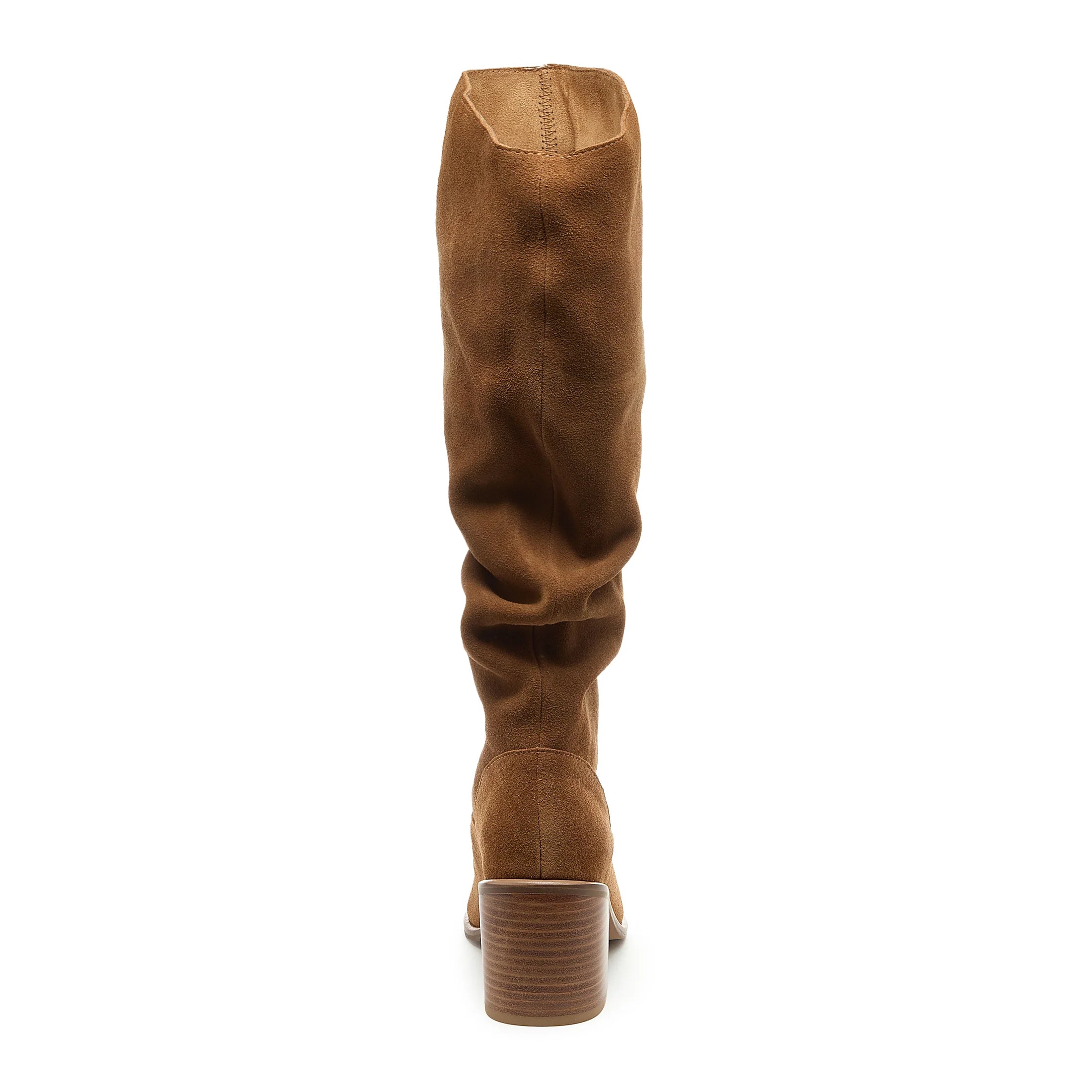 Looking for that effortlessly chic fall boot that goes with everything? Meet the Easton Slouchy Tall Boot by Kelsi Dagger. Crafted from buttery-soft cow suede in a rich honey hue, this pull-on boot combines relaxed sophistication with all-day comfort. The slouchy shaft adds texture and movement, while the stacked leather heel gives just the right amount of lift. Perfect with jeans, dresses, or skirts — this is the boot you’ll be reaching for on repeat.