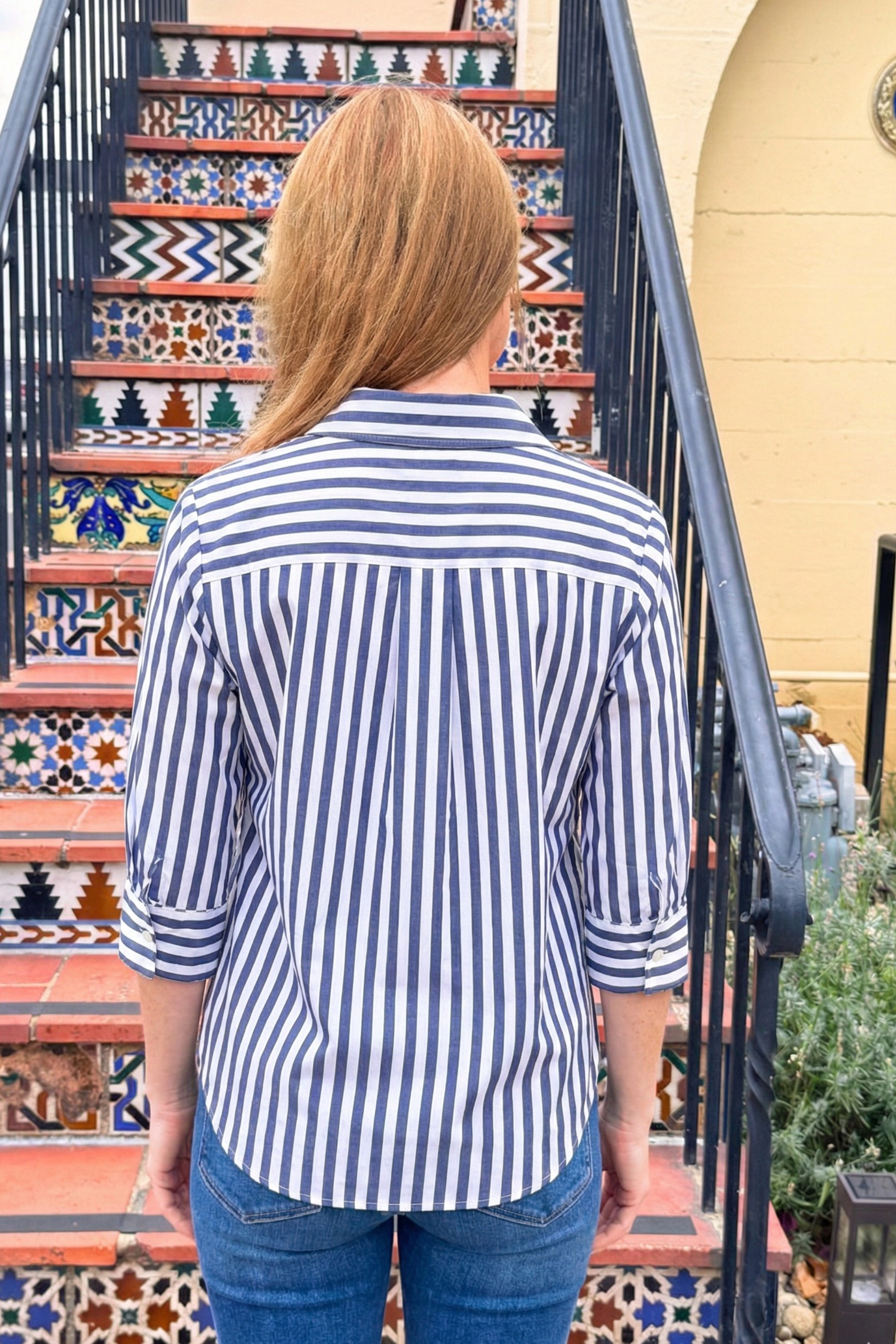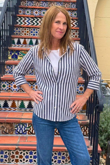 Not sure what to throw on when you want to look polished but still feel completely relaxed? This indigo and white striped button-up is that effortless, slightly oversized layer you’ll reach for again and again.