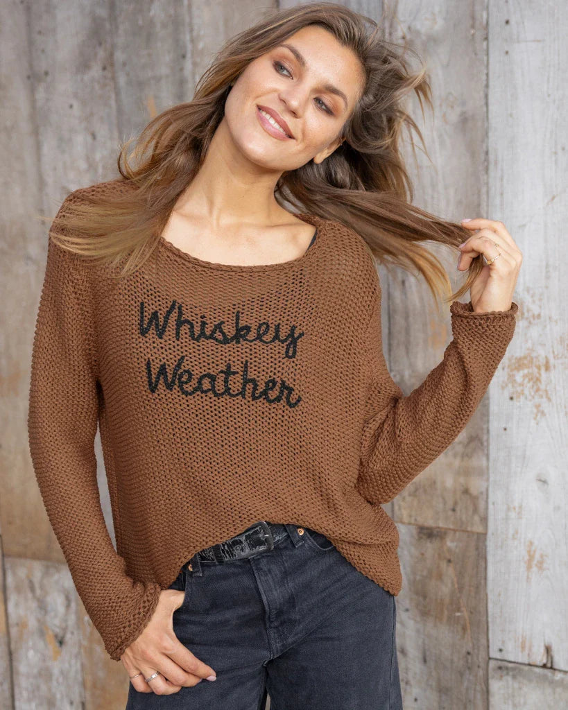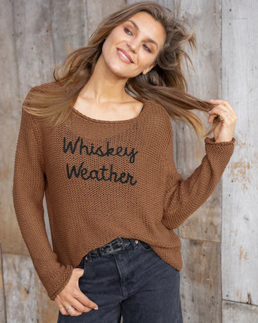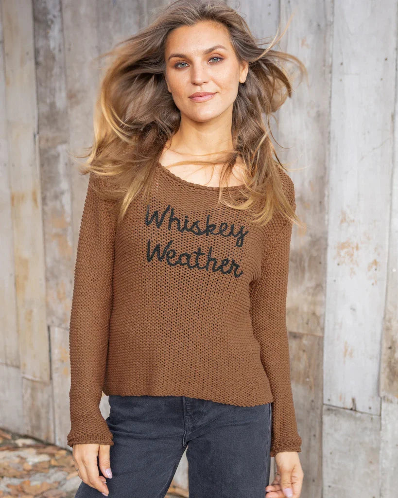 Is it ever too chilly for a little whiskey weather? This cozy cotton blend sweater brings effortless fall vibes with its hand-embroidered “Whiskey Weather” graphic in rich sepia rust. Crafted in a warm golden brown hue, it features a relaxed fit with inset sleeves, roll-edge neckline and cuffs, and subtle side slits for easy movement. Part of the beloved Whiskey Weather collection, this style is all about staying cozy and celebrating those laid-back moments that pair perfectly with good friends (and a good pour).
