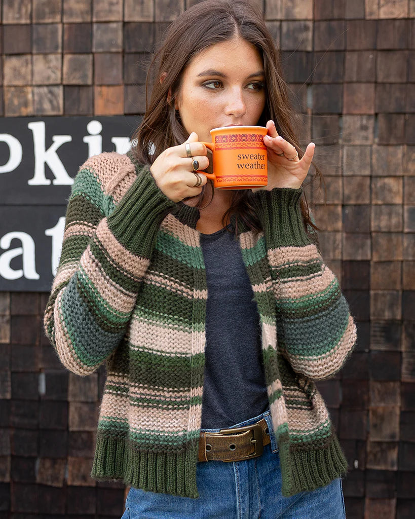 Ready to wrap yourself in fall? The Inez Striped Cardigan is everything you love about cozy season—chunky texture, rich color, and effortless style. Designed in a warm loden hue with bold autumnal stripes, this soft, slightly fuzzy cardigan features a relaxed, super-cropped fit and raglan sleeves for easy layering. Finished with ribbed trim at the neckline, cuffs, and hem, it’s the ideal piece to throw over a tee, tank, or even a dress when the temperature dips.